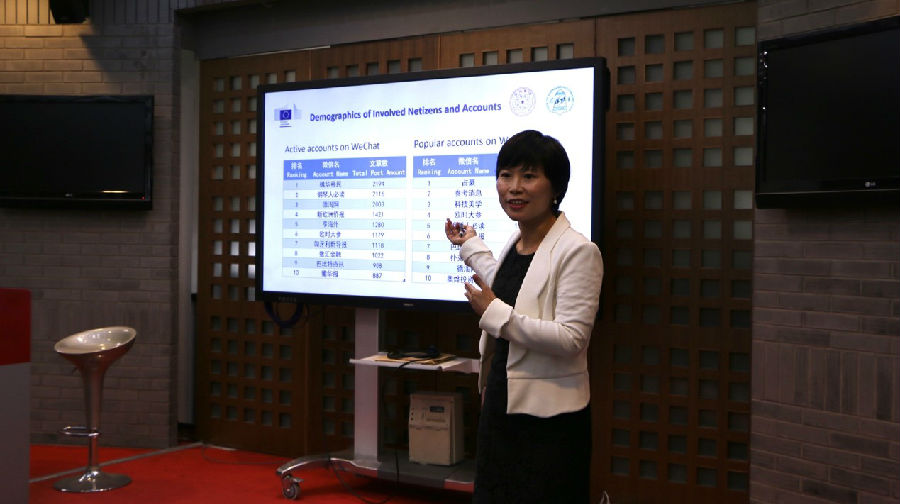 At the first session, Associate Professor Zhang Li, Director of the Institute of Public Relations and Strategic Communication of the School of Journalism and Communication at Tsinghua University, and her doctoral student Xu Zhiyuan delivered a speech on research findings from a project called “Constructing the EU Images and EU-China Relations in Chinese Social Media.” The project was funded by the EU’s Jean Monnet Programme. The research findings generated deep discussions.
