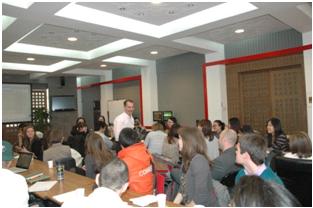 During the class, "Business News Data Mining and Analysis," Professor Miller encouraged the students to interview their counterparts from the other country on food preferences and eating habits, a form of data mining. In a lively speed-dating format, each student interviewed 10 students from the other country and had to write about what they learned. At the end of the class, Students of both sides exchanged souvenirs and took photos together.