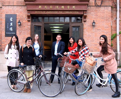 Alexander Boome, program director for the Global Sources scholarships at Tsinghua University, met with recipients April 23 to discuss their internship experiences and career plans.