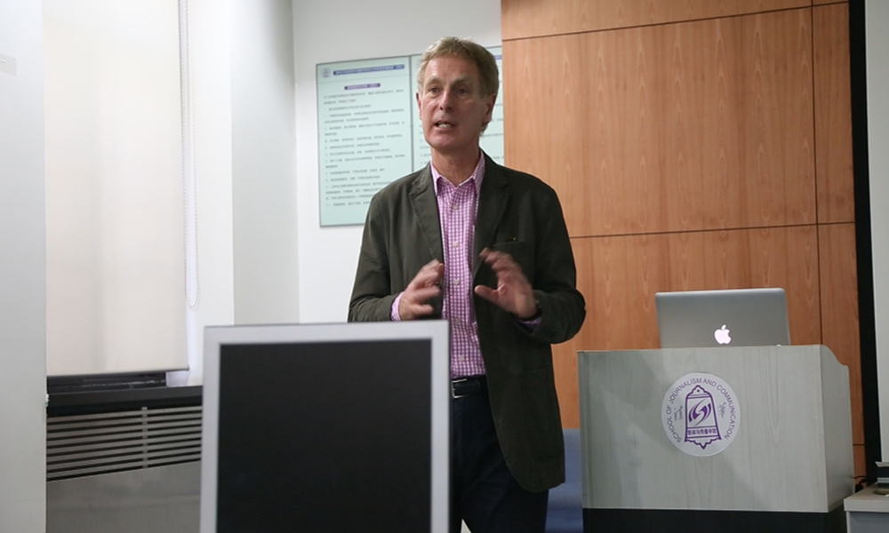 Hugo de Burgh, a professor from the China media center at Westminster University in the United Kingdom, completed his first visit to the School of Journalism and Communication by giving a lecture on “British Media and its Characteristics” on November 6.