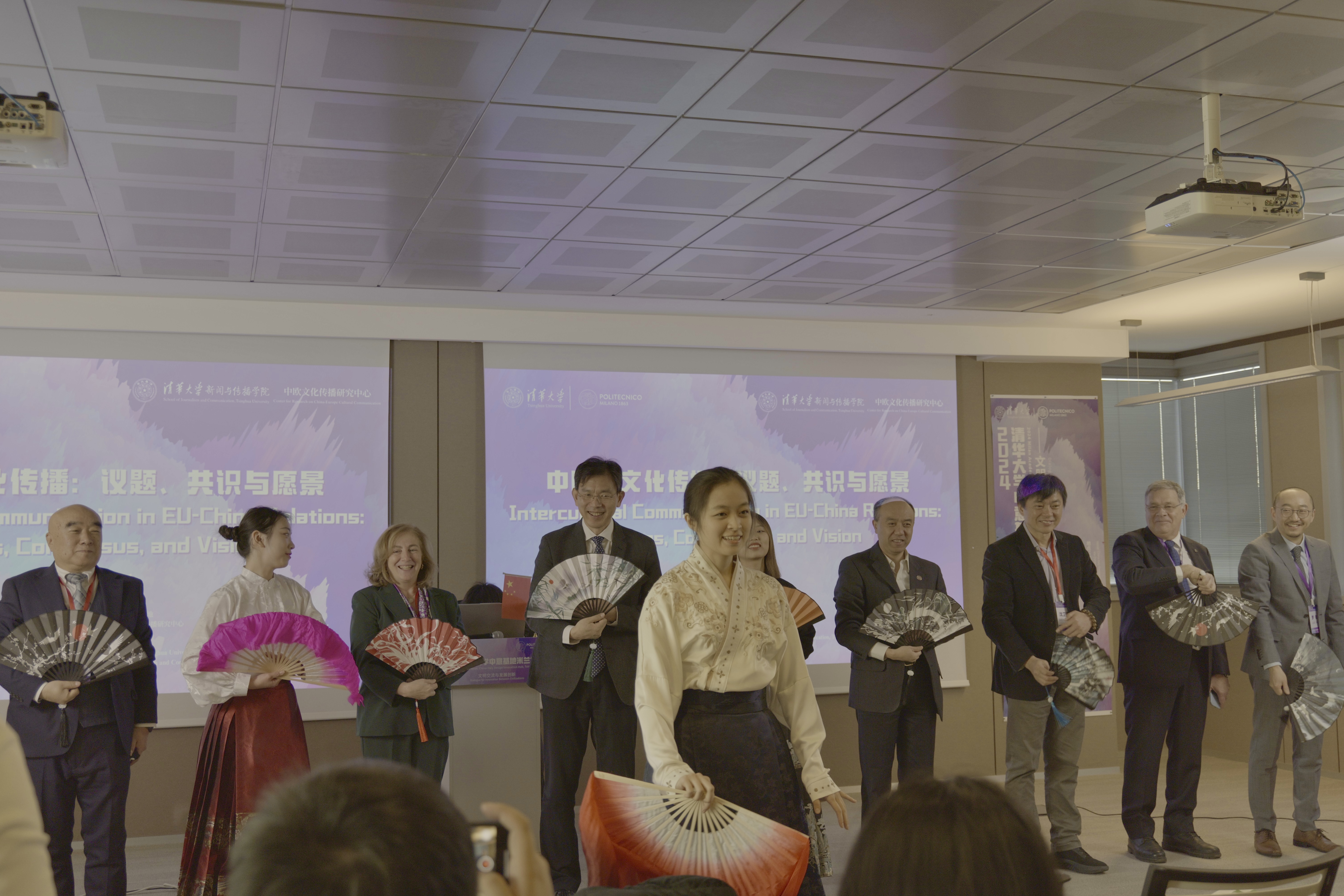 Before the opening ceremony, students from Tsinghua University's School of Journalism and Communication and Rixin College, holding paper fans and wearing horse-faced dresses, performed traditional Chinese dances with the guests. Afterwards, renowned experts and scholars shared their researh and insights on cross-cultural communication between China and Europe from various perspectives, including communication, political science, literature and history.