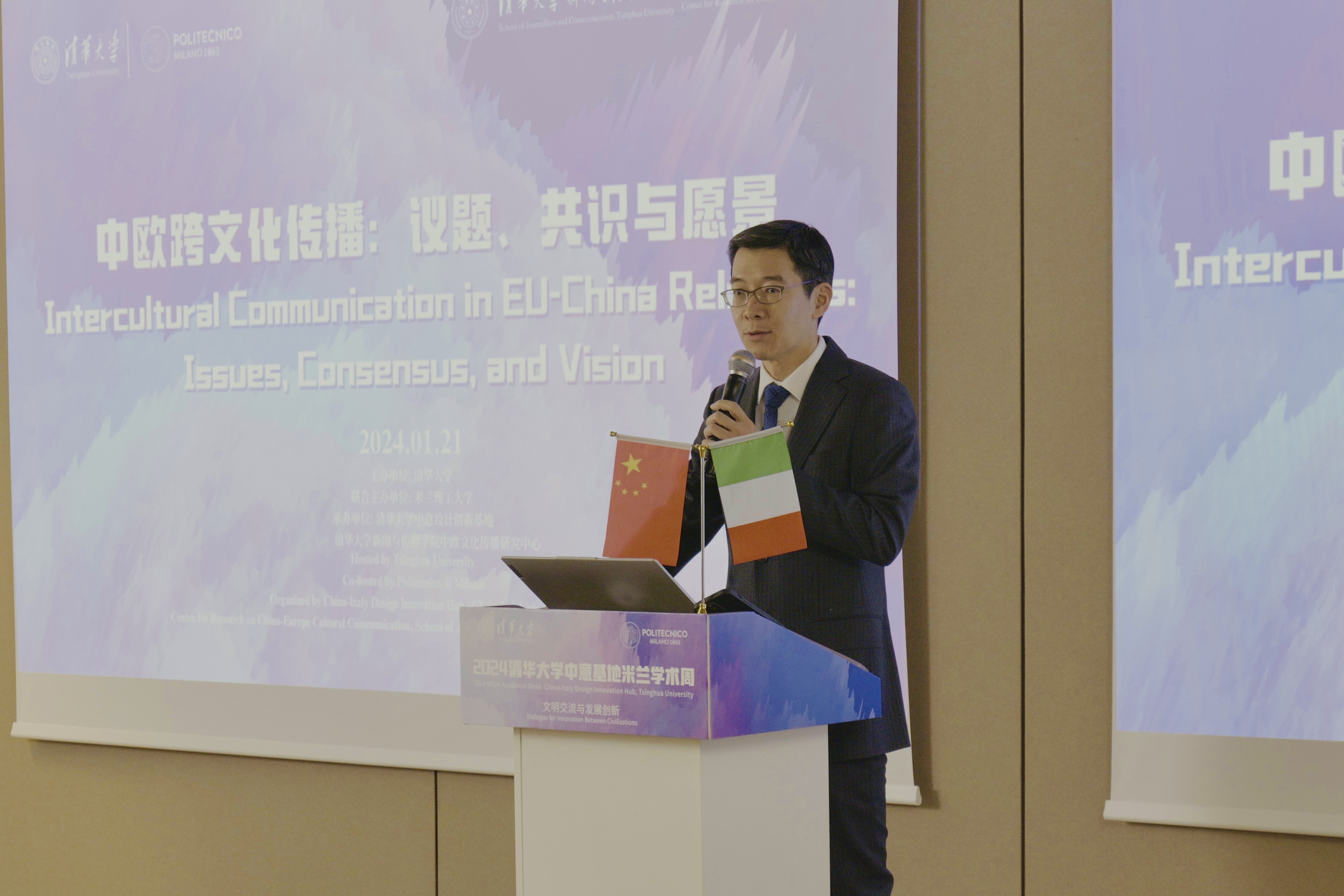 The "Intercultural Communication in EU-China Relations: Issues, Consensus and Vision" forum was held in Milan, Italy, on January 21, 2024. The forum was hosted by Tsinghua University, co-hosted by Politecnico di Milano, and organized by China-Italy Design Innovation Hub of Tsinghua University and Center for Research on China-Europe Cultural Communication, School of Journalism and Communication, Tsinghua University.