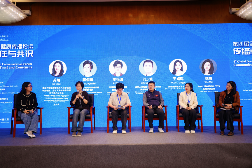 蒋俏蕾教授、中央广播电视总台CGTN新媒体部主编魏威、澎湃新闻国际新闻部副总监兼主编李怡清、腾讯新闻较真平台总监王婧璐,以及深圳市人工智能与机器人研究院具身智能中心主任刘少山从虚假信息识别与媒介伦理等角度,探讨了AI与传播之间的平衡与边界。